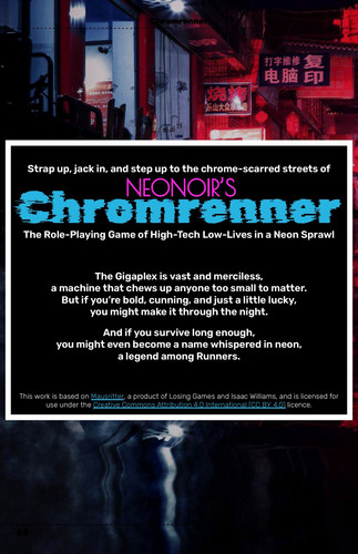 NEONOIR’s Chromrenner is an independent production by Rob Justice and is not affiliated with Losing Games. It is published under the Mausritter Third Party Licence.