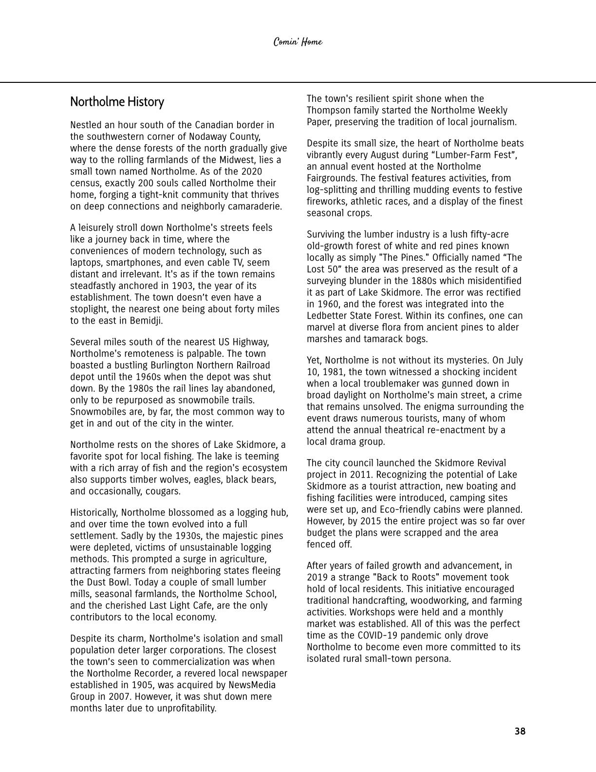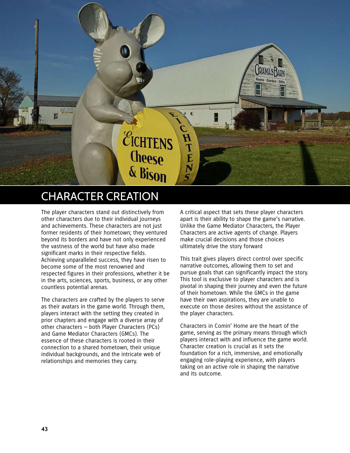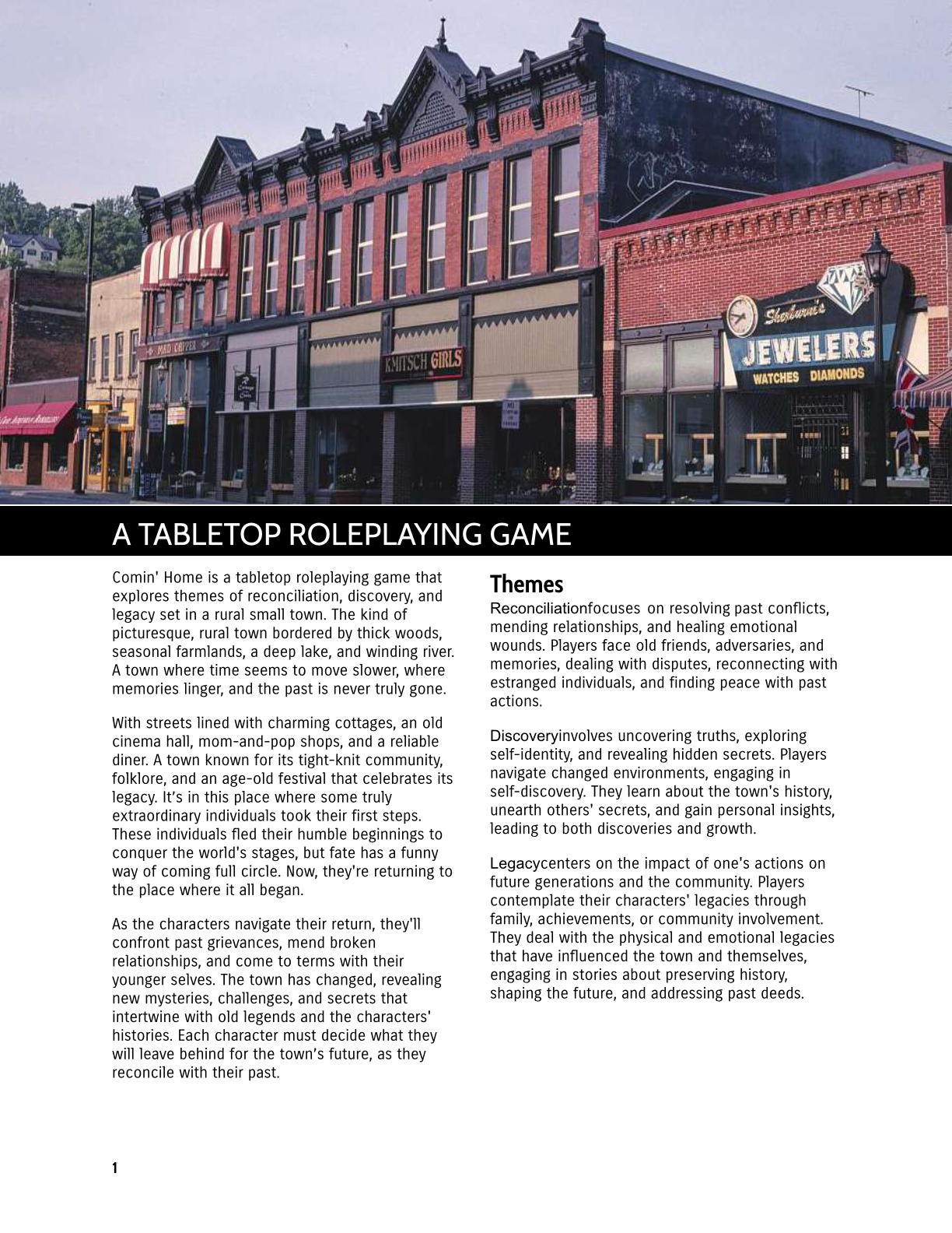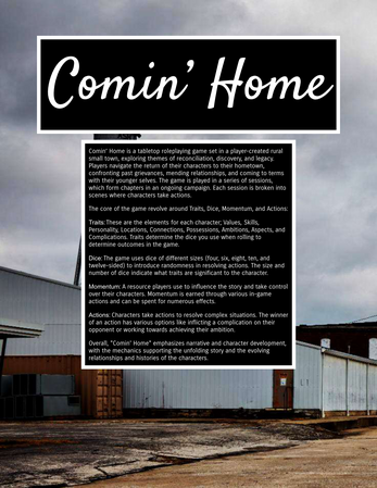 Comin’ Home is a tabletop roleplaying game set in a player-created rural small town, exploring themes of reconciliation, discovery, and legacy. Players navigate the return of their characters to their hometown, confronting past grievances, mending relationships, and coming to terms with their younger selves. The game is played in a series of sessions, which form chapters in an ongoing campaign. Each session is broken into scenes where characters take actions.